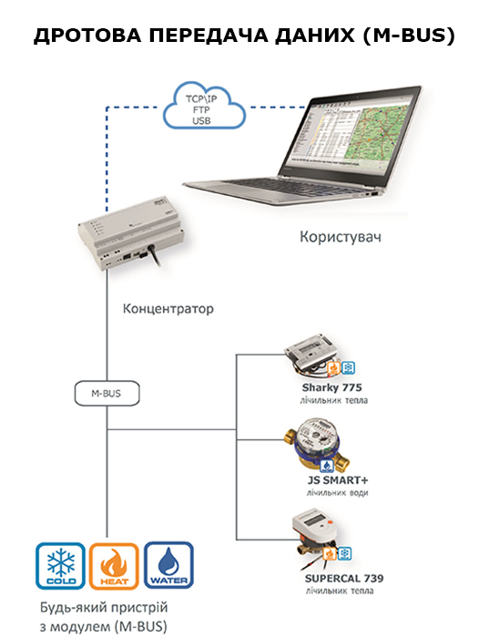 M-BUS система призначена для організації збору даних з різних вимірювальних приладів в місцях високої концентрації (багатоквартирні житлові будинки, промислові об'єкти).